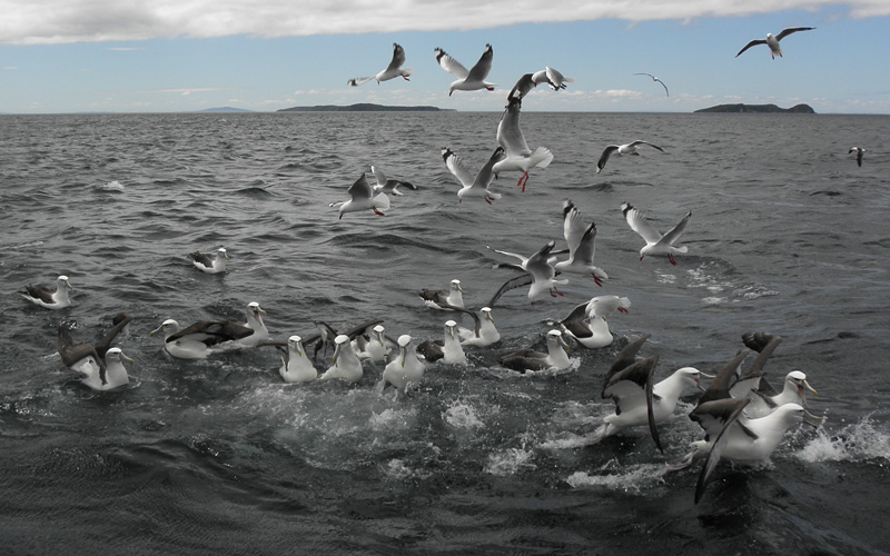 | White-capped Albatrosses and Red-billed Gulls wolf down every