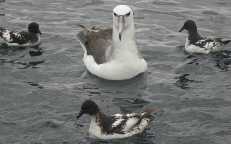 | Immature White-capped Albatross with Snares Cape Petrels. |