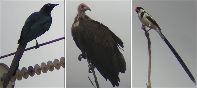 From left: Long-tailed Glossy Starling, Hooded Vulture and Pin-tailed Whydah.