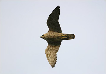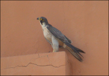 The stationary female Peregrine Falcon on its favourite watch point at the top of Hotel N'Gor. Photo: Dan Mangsbo